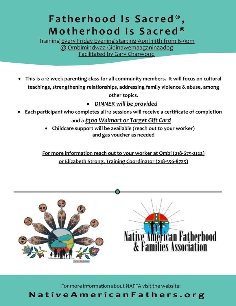 Beginning this Friday, April 14th, a 12-week long weekly parenting class for all community members, facilitated by Gary Charwood, will be taking place at Ombimindwaa Gidinawemaaganinaadog every Friday night from 6-9pm. Dinner will be provided!