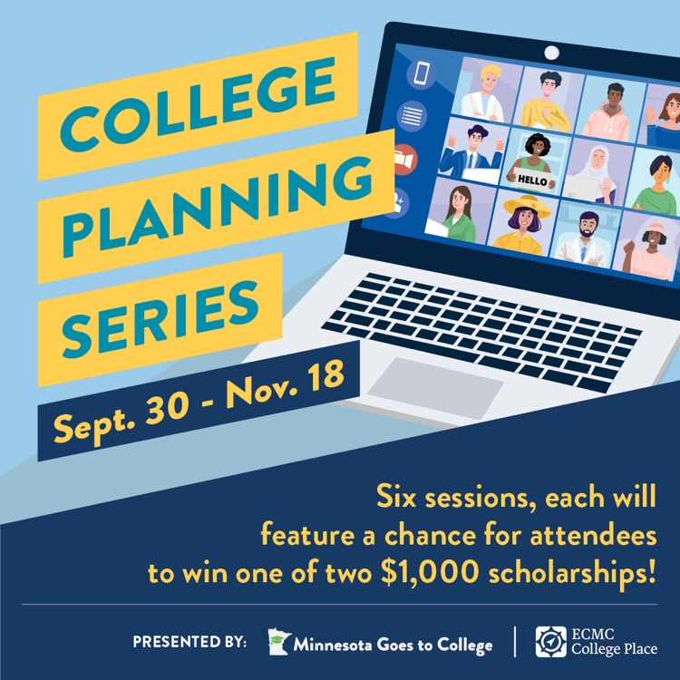 Join us for virtual college and financial aid events, Tuesday evenings this fall. The College Planning Series will cover important college search and finanical aid topics with professionals and live Q & A. The events are free for MN students and families. Interpreters are available in Hmong, Spanish, Somali. Visit bit.ly/CollegePlanningSeries for more information and to register.